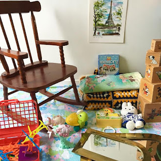 Un Rocking-chair enfant*, un drap Bambi vintage*, un jeu de memory Toy Story*, un plaid en crochet granny square *, un jeu de cubes ancien à encastrer en bois Disney*, Miffy*, une boite à musique vintage*, deux miroirs en forme de fenêtre en laiton doré*, la tortue à tirer fisher price vintage*, Jeu Patatras Vintage *